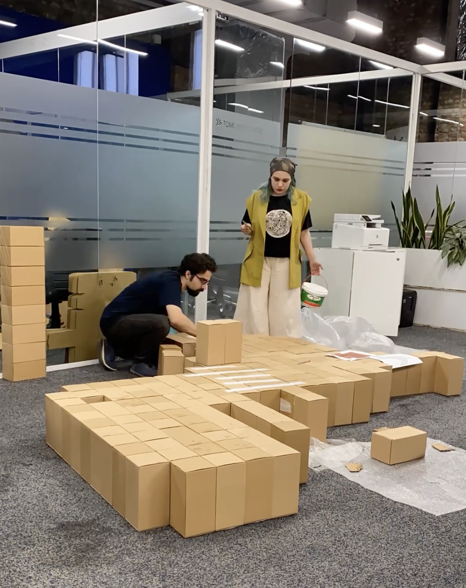 برای ساختنش سراغ متریال جعبه رفتیم چون دیجی‌کالا به جعبه‌هایش معروف است؛ از طرفی به‌نظرمان داینو انقدر راحت و خاکی بود که کاغذ بهترین ماده برای عینیت بخشیدن به آن در جهان  خارج بود. جعبه‌های پیکسلی را روی هم چیدیم و این سازه‌ی چند درچند متری ظاهر شد.