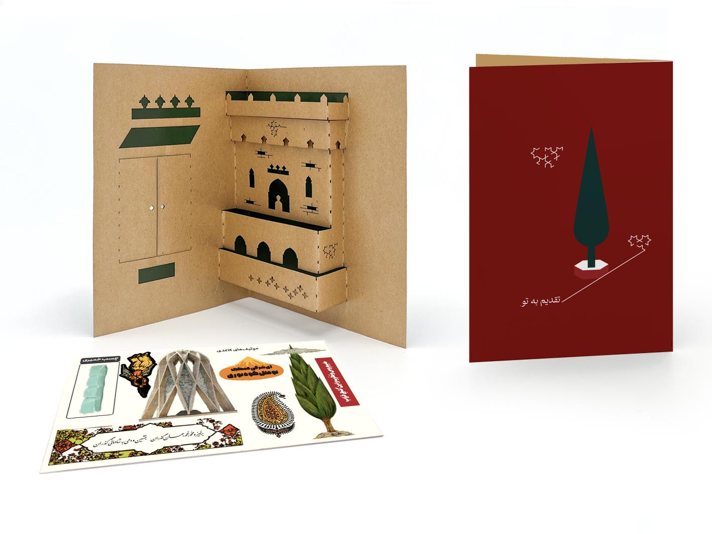 در کارت پستال پاپ‌آپ طرح خیام نیشابوری، شکوه معماری ایرانی در میان صفحه‌ای از هنر نگارگری ایرانی پدیدار می‌شود.