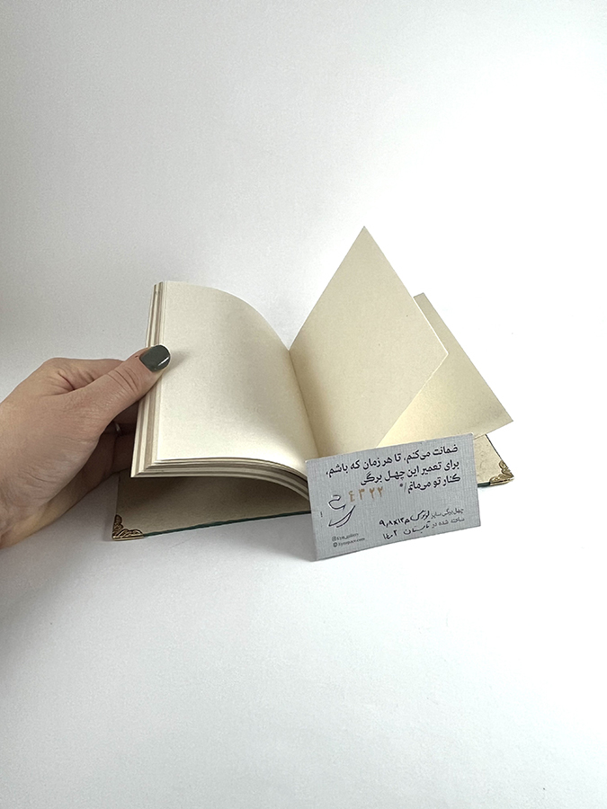 دفترچه یادداشت 322 اتمام موجودی متن سفارشی روی جلد متن مدنظر شما روی جلد، در کنار طرح فعلی، اضافه خواهد شد. => متن سفارشی داخل صفحات دفترچه میتوانید در صفحه اول، متن دلخواه اضافه کنید. => افزودن به سبد خرید مشخصات محصول قطعلوتوس ۹×۱۳ نظرات هنوز نظری ثبت نشده اولین نفری باشید که نظر میدهید ثبت نظر نظر شما راجع به این محصول چیست؟ دفترچه یادداشت 322 چه امتیازی به این محصول میدهید. ★ ★ ★ ★ ★ نام شما عنوان نظر شما متن نظر شما
